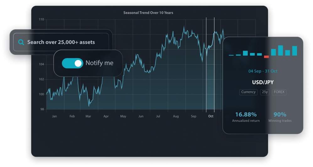 Every market has assets that tend to rise or fall at the same time each year. The Screener analyzes thousands of them and shows you only the ones with statistically backed seasonal patterns. Filter by market, timeframe and return threshold. You get a focused shortlist of opportunities, not a wall of noise.