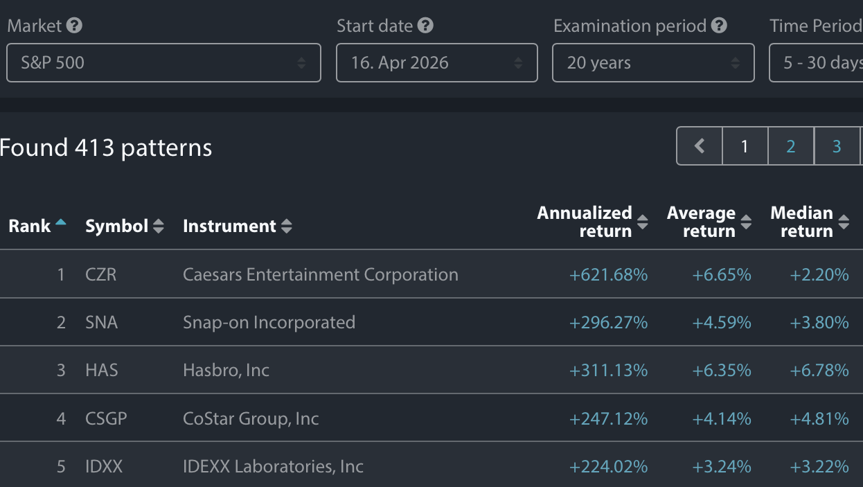 Every market has assets that tend to rise or fall at the same time each year. The Screener analyzes thousands of them and shows you only the ones with statistically backed seasonal patterns. Filter by market, timeframe and return threshold. You get a focused shortlist of opportunities, not a wall of noise.