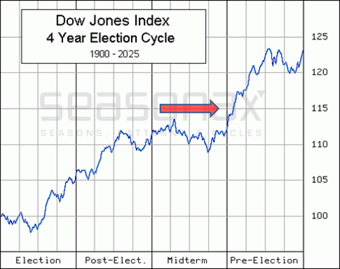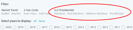 Above “Election” is the average trend for all election years; above “Post-Elect.”, for all post-election years; above “Midterm,” for all midterm election years; and above “Pre-Election,” for all pre-election years. The chart allows you to examine developments within the cycle in detail.